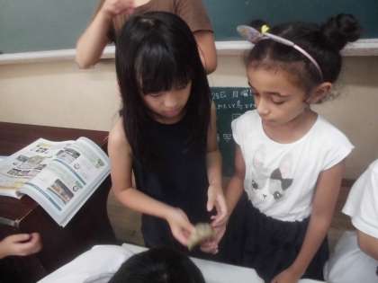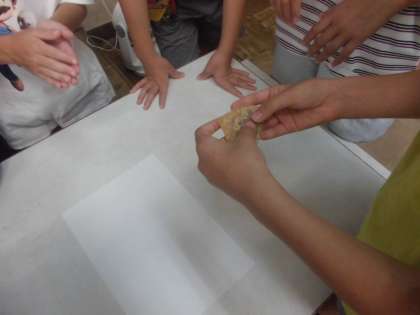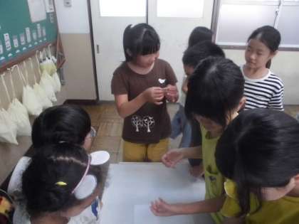 「工場でつくられるもの」という学習の中で生八つ橋を実際に触って、観察している様子です。