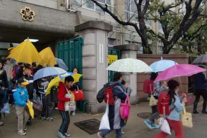 傘をさした子が殺到すると本校の正門はこんな状態です。