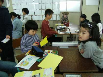 今日の3時間目は,“にこにこタイム”でした。6年生に向けてのお祝いのメッセージカード作りです。1年生から5年生まで一人ひとりがお礼の言葉や思い出の事を書いてきて,それを今日,1枚のカードに仕上げました。5年生や4年生の新リーダーさんが1年生を迎えにきてくれて,どのグループもスムーズに始まったようでした。また,活動中はどのグループも無駄なお話をしているようなところもなく集中していました。きっと素敵なプレゼントになったと思います。1年生の教室に戻った時も「楽しかった」「がんばって良いのができた」と言っていました。
