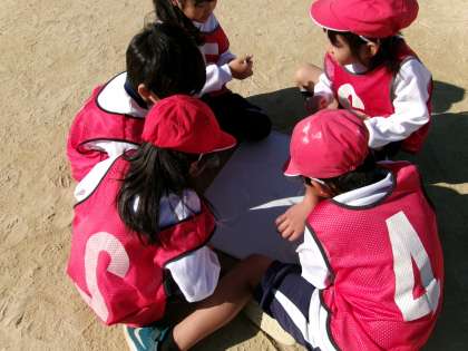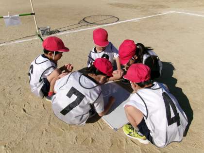 試合前の作戦タイムでは,チーム全員で集まって一生懸命作戦を練っています。