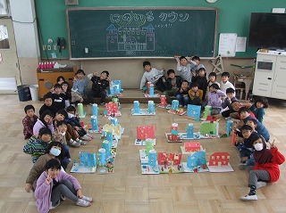 作った家を持ち寄って、2年1組タウンにしてみました。