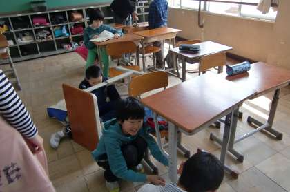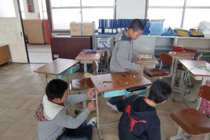 中間休みの6年生の教室です。机や椅子の高さを調節しています。