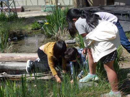 心地良い春風の中、中間休みにビオトープが憩いの場となっています。ザリガニを見つけたり、藤棚の下でくつろいだりして、思い思いの楽しみ方を見つけています。
