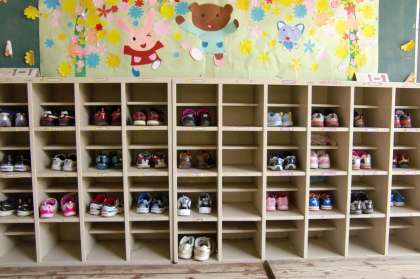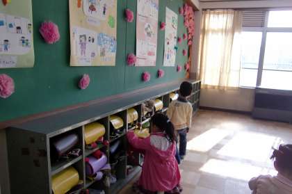 担任の先生に指導されたとおりにランドセルを上手にロッカーに入れています。写真を見てください。きれいに入ってますよね。