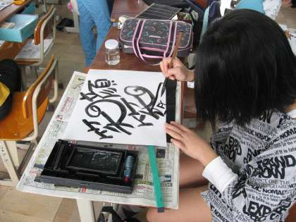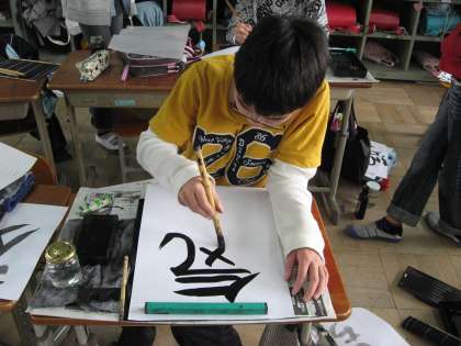 毛筆をつかい,自分の一年間の気持ちを言葉に表しました。力強く書いている子や発想力豊かに墨で表現している子など様々でした。どの子の作品もとてもいきいきしていて,見ていて思わず「お〜。」と言ってしまいました。