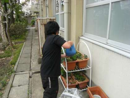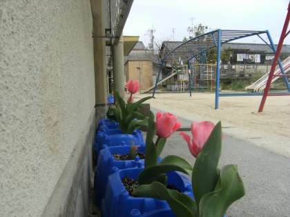桜の花以外にも,いろいろな花が咲いています。校舎の南側で「イチゴ」の花が咲いています。世話をしている地道な努力を続ける人がいるからですね。また,北校舎には,以前お知らせした「チューリップ」の花がもう咲いています。ピンクの色がとても可愛いらしいです。新2年生が世話をしています