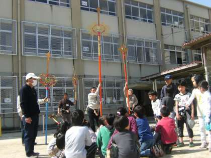 今日は,3年生の「剣鉾」体験がありました。部活動「剣鉾」を指導してくださっている“吉田剣鉾保存会”の皆様が教えに来てくださいました。昨年度,国民文化祭が京都を会場にあり,第四錦林小学校が開会パレードの先頭を切って御池通を歩きました。その,公式記録集にも“第四錦林小学校部活動「剣鉾」・吉田剣鉾保存会”が載っています。今年も地域の行事や夏祭りで発表の機会があります。今年度から「剣鉾」をやってみようという皆を待っています。