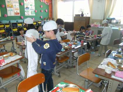 1年生が楽しみにしていた給食が始まりました。1日目なので,ナプキンの敷き方,食器の置き方から説明しました。給食当番は,給食室に行って,何を持ってくるのか,ドキドキしていました。みんなに,スパゲティー・野菜のソティー・牛乳・デザートを配り,着ていたエプロンを畳んで,袋に入れてやっと準備が終わりです。とても美味しい給食で,残りが全然ありませんでした。
