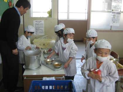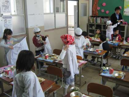 給食の前に,学活の授業で,準備の仕方,当番の仕方やエプロンのたたみ方などを子ども達に話しました。でも,お話が長くなってしまい,