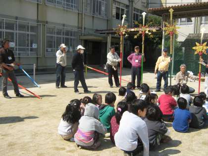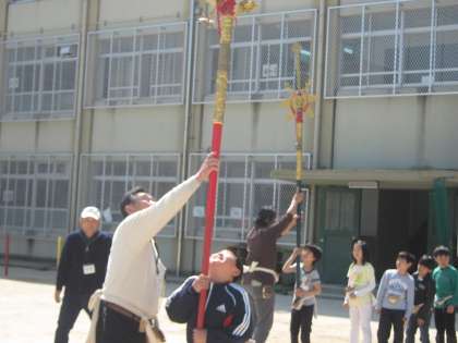 今日は「剣鉾」の体験です。剣鉾の歴史などくわしくお話をしていただいた後で,「姿勢」「歩き方」とウォーミングアップがあり,いよいよ剣鉾を差して歩きました。