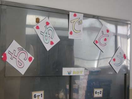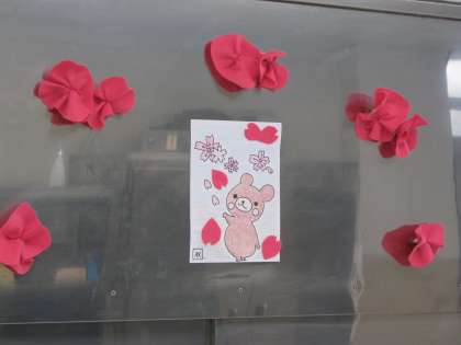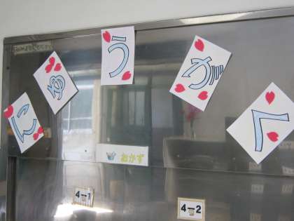 給食室では,1年生の入学をお祝いする飾りを,給食調理員さんが作ってくださっていました。給食室が華やいでいます。