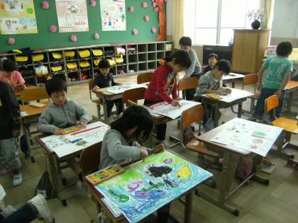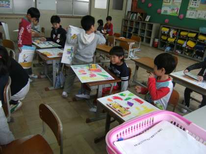 初めての図画工作です。「自分の好きな物」を決めて,自由に描きました。みんな最後まできちんと仕上げることができました。のびのびと描いている絵がたくさんあって,見ているこちら側も楽しくなりました。