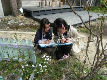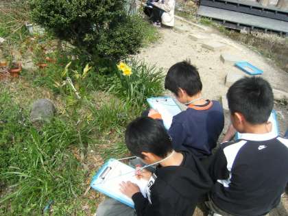四季を通じて,ビオトープでの自然の観察を続けていきます。今日は,「冬と比べて今がどう違うのかを見つけよう」というテーマでそれぞれが見つけたものを,スケッチしました。