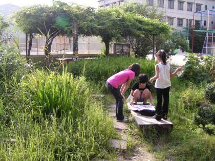 ビオトープの作物の世話,水やり,観察など毎日交代で児童がきています。