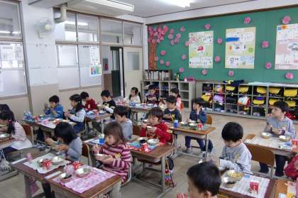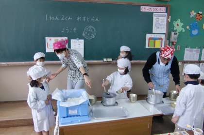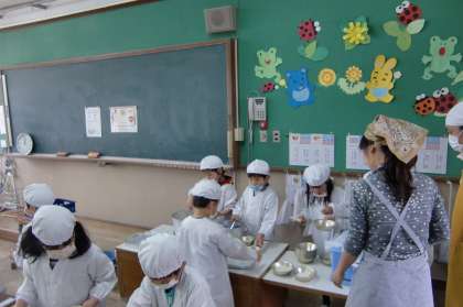 給食の配膳の様子や食べている様子を見に1年生の教室に行きました。