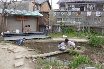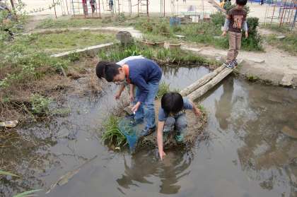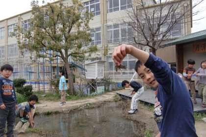今日は池をのぞきこむ男子グループ『ザリガニつかみ隊』。(もちろんこんなグループはありません)