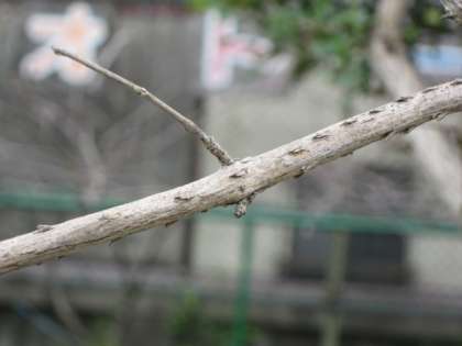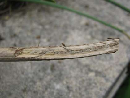 枯れ枝にセミがたまごを産みつけたあとだそうです。枯れ枝を開いてみました。たまごは,このあと地中で7年間の間に大きくなるそうです。今年産みつけられたたまごが,成虫になるのは,今年の1年生が6年生か中学生になった頃ですね。