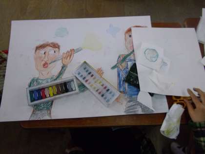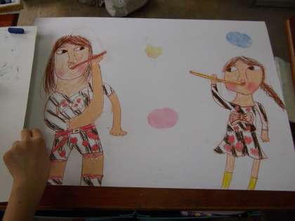 図画工作の時間では,「シャボン玉とんだ」という作品を作っています。自分と友だちが楽しくシャボン玉を吹いているところを想像して描いています。