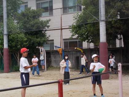 連休明け初日は雨模様の天気でした。二日目は運動場も乾き、待ちかねたように中間休みに運動場に飛び出しそれぞれの遊びに熱中していました。