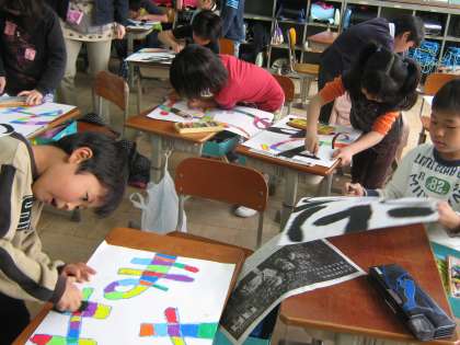 自分の名前を絵にしています。名前をひらがなにすると文字の数の多い人,少ない人,とあることがわかります。文字の数が多い方が大変と思うかもわかりませんが,この作品の場合はそうでもないのです。それは,実はこの作品,上下左右の友達の作品とつながれるように,ある「仕掛け」があるのです。そのため,それぞれに工夫あり苦労あり・・