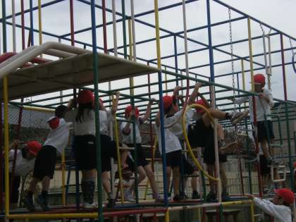 2年生になって,大きい総合遊具の遊び方も学習しました。安全に気を付けて少しずつ高さに慣れていきます。また,うんていをするグループと交代で行いました。後半は,鬼ごっこを思いっきり楽しみました。