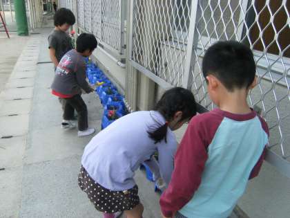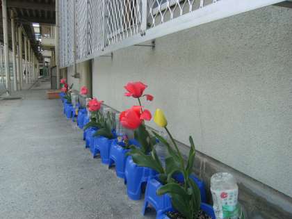 2年生のチューリップが,また,きれいに咲いています。黄色のチューリップが鮮やかに咲いています。掃除の後の5分休みを使って,水やりをしてくれました。