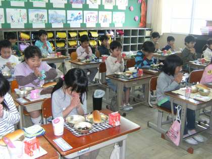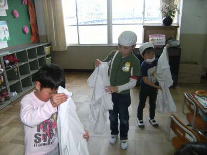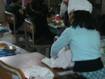 1年生の給食準備も少しずつ慣れてきました。給食を配り終わって,給食当番は,エプロンをたたみます。「そでとそでを合わせて。二つに折って。・・・」と順序良く畳んでいきます。給食当番が片づけて座って,いよいよ「いただきます」となります。今日のシチューが温かなうちに,てきぱきと準備できたようです。