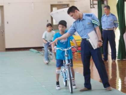 四年生の自転車教室が開催され、警察署の方の【自転車の安全な乗り方】のお手本を見学した後は実地練習です。署員の方が見守る中緊張しているようでした。これを機会に改めて安全に自転車にのるためにはどうすればよいか、を意識してほしいです。