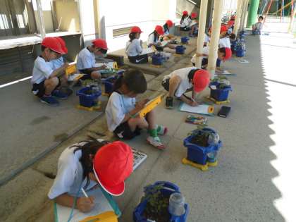 生活科「ぐんぐんそだて おいしいやさい」の学習で植えたトマトの苗が少しずつ成長しています。