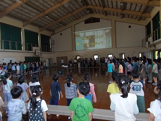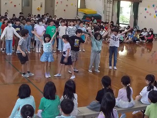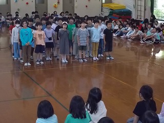 1年生をむかえる会で「ハッピーソング」を歌いました。振り付けをつけて、踊りながら歌ったので、会場も盛り上がっていました。最後に全校で歌った「虹」もいい声で歌っていました。