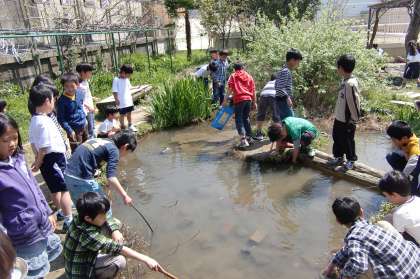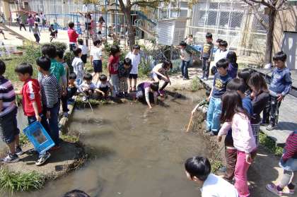 池の水が濁るとザリガニが見えなくなるので,子どもたちなりに慎重に慎重に手を入れるのですが,何せ手の数が多いものですから,水はまたたく間に濁ってしまいます。