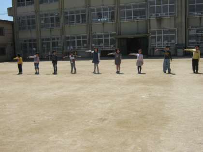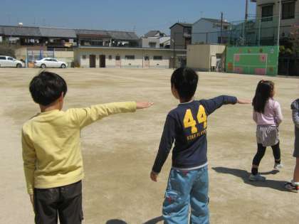 写真は四錦の運動場で北に向かって立っているところです。右手を水平まで上げて「東」,左手を上げて「西」,両手を首の後ろに揃えて曲げて「南」,そのまま両手を前にのばして前にならえで「北」。