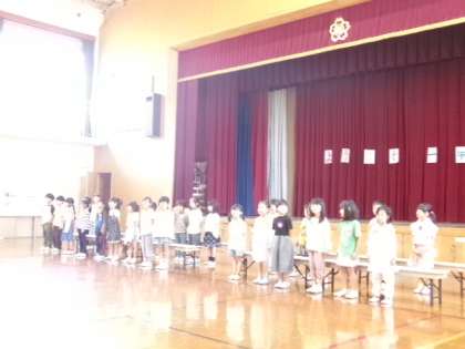 中間休み、企画委員さんに作ってもらった名札を胸につけながら、「私の声は、皆に聞こえるかな。」と不安げ。でも、6年生のお兄さん、お姉さんに手をつないでもらうと、皆ドキドキしながらも、笑顔で入場できました。2年生から6年生の歌や出し物も楽しみ、自分たちの発表も大きな声でやりきりました。「保育園とは、違うなあ。」「皆にぱちぱちしてもらって嬉しかった。」「ビリーブの歌が、私も保育園で歌ったよ。」などたくさんの感想がでてきました。
