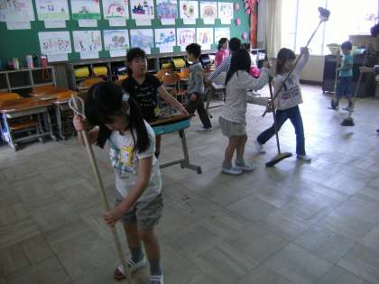 今日は,6年生が修学旅行に出かけています。今まで1年生の掃除にお手伝いに来てくれていましたが,今日は自分たちだけで掃除です。ほうきを担当する人・雑巾で机を拭く人などにわかれてがんばっていました。