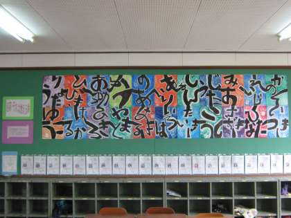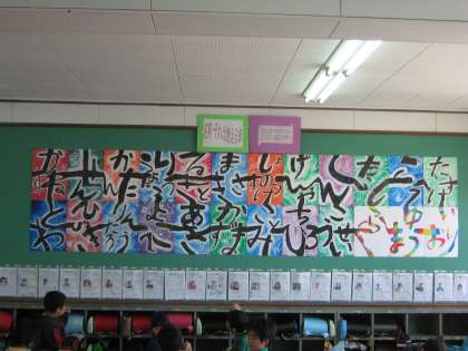 先週から取り組んでいた「名前を絵にしよう」の作品が完成しました。名前をデザインしたまわりを絵の具のグラデーションでていねいに塗りました。白から純色まで少しずつ,少しずつ彩度を上げていく作業はなかなか大変でしたが,さすがは3年生。根気よく仕上げることができました。ひとりひとりの作品もみごとです。が,つないでみると,また違った楽しさが味わえて子どもたちもしばらくじっとながめていました。