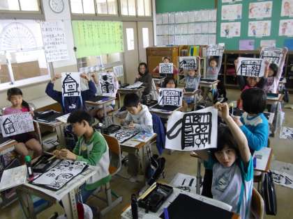 今日は,筆の動かし方を工夫して,折れ・とめ・はね・はらいなどのいろいろな方法を使って書きました。すばらしい作品がたくさん出来上がりました。これからが楽しみです。