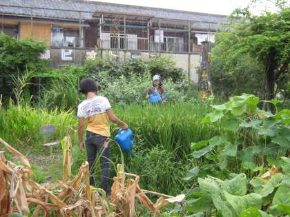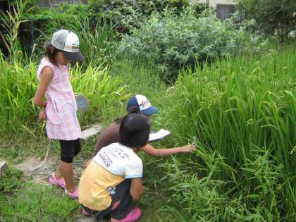 5年生がビオトープの稲の観察に来ています。
