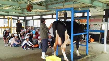 淡路島牧場で乳しぼり体験。あたたかくヌルッとした感触に少し戸惑う子もいましたが、みんな上手にできました。