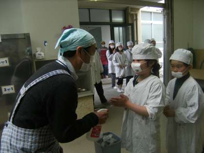 給食のときに,手を洗った後給食当番はアルコールの消毒をします。その時に,担当の先生にお礼を言うのですが,「目を合わせて」お礼を言うように言葉かけをしています。学校の内外で,話をする時に「相手の目を見て話そう」を,今年度の“四錦のなかま”で取り上げています。この給食の場での習慣が広がってほしいと思います。