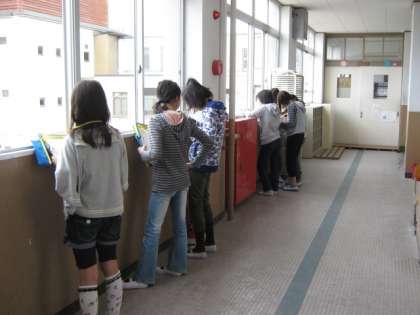 雲の観察・・・今日は雨でした。いつもは運動場から観察していたんですが、今日は校舎の窓や、渡り廊下から観察しました。4日間観察で、雲ひとつない晴天から、雨の雲まで〜運よくいろいろな空・雲を観察することができました。