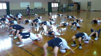今日は雨で運動場が使えなかったので,体育館で体ほぐし運動をしました。