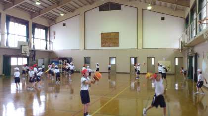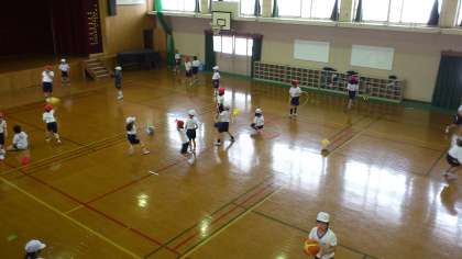 初めは軽く体操し,みんなで一斉にブリッジをしました。次はペアになり,座ったまま背中を合わせ「せーの」と息を合わせて立つ運動。最後はボールやフラフープ,フリスビーなどを使って,運動しました。自分たちでルールを考え,それぞれが思い思いの運動をして汗を流しました。