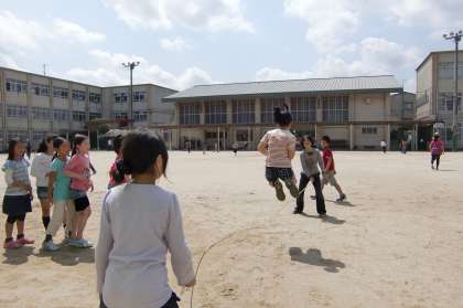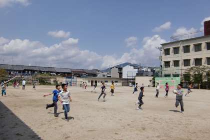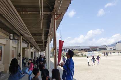 昼休み,日差しは戻ったものの,運動場にはまだ少し水たまりも…。