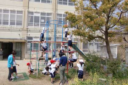 1年生が体育の後,教室に戻るまでのわずかな時間ですが,『フリータイム』を楽しく過ごしました。池周辺やジャングルジムがやはり人気のようです。