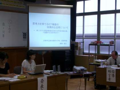 5日の分科会では,昨年の1年生の「ひきざん」の授業をもとに,思考力を育てるためには,ICTを有効に活用することが大切であるということを発表しました。研究会では,数図ブロックを子どもたちが操作して,それをもとに説明したこと,ノートに計算方法を文章で,筋道立てて書くように指導したこと,そして,ICTを有効な支援として活用できたことなどを評価していただきました。