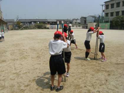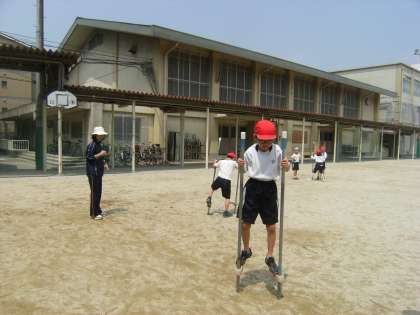 2年生になって,一輪車と竹馬の練習をしました。一輪車は,グループで交代して使いました。竹馬は二人でペアになり,押さえる人と乗る人とで力を合わせて練習しました。