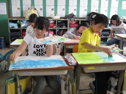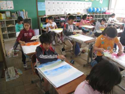 図工で三角形を何個も積み重ねて,お城を作り上げる学習を始めました。今日はその城の背景となる画用紙作りを行いました。
