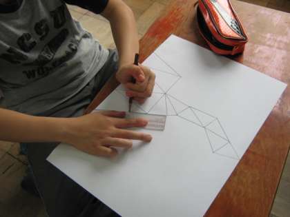次に,三角形を定規を使って書き,積み重ね,城ができるかどうか設計図を描いてみました。