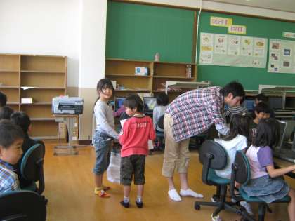 コンピュータ室では,3年生が授業をされていたのですが・・・探検に来た子ども達を先生が見つけて,「入ってもいいよ」と声をかけてくださいました。