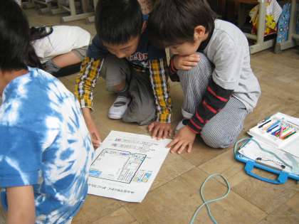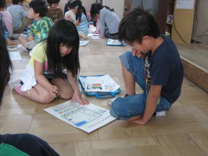 学校の地図を確認しながら,シールを貼ったところを2年生が色をぬってくれました。